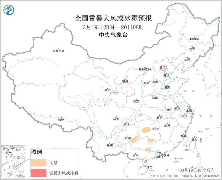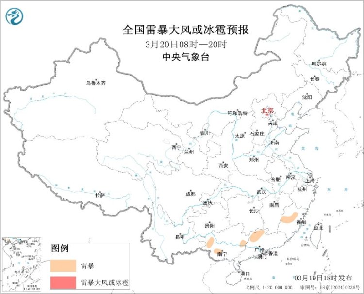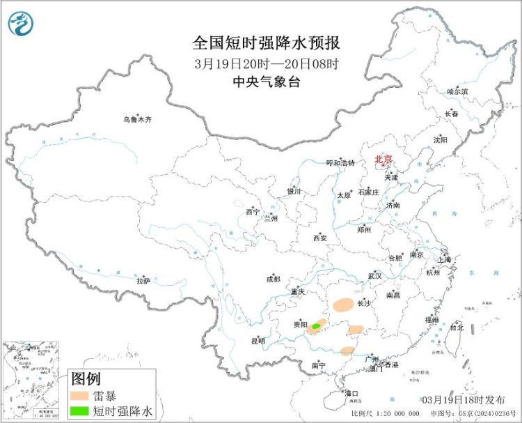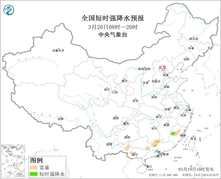 预计3月19日20时至20日20时,福建西部、贵州东南部、广东北部等地局地将有短时强降水天气,小时雨量20-30毫米;另外,湖南中部和南部、福建中西部、贵州东南部、广西东部和西部、广东北部等地局地将有雷暴。